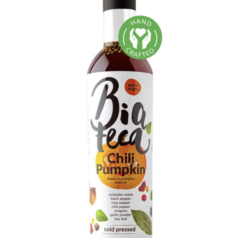 The condiment is based on cold-pressed pumpkin seed oil blended with spices and chili. Without additives or sugar, Chili Pumpkin can be used as a dressing, marinade or finishing oil.