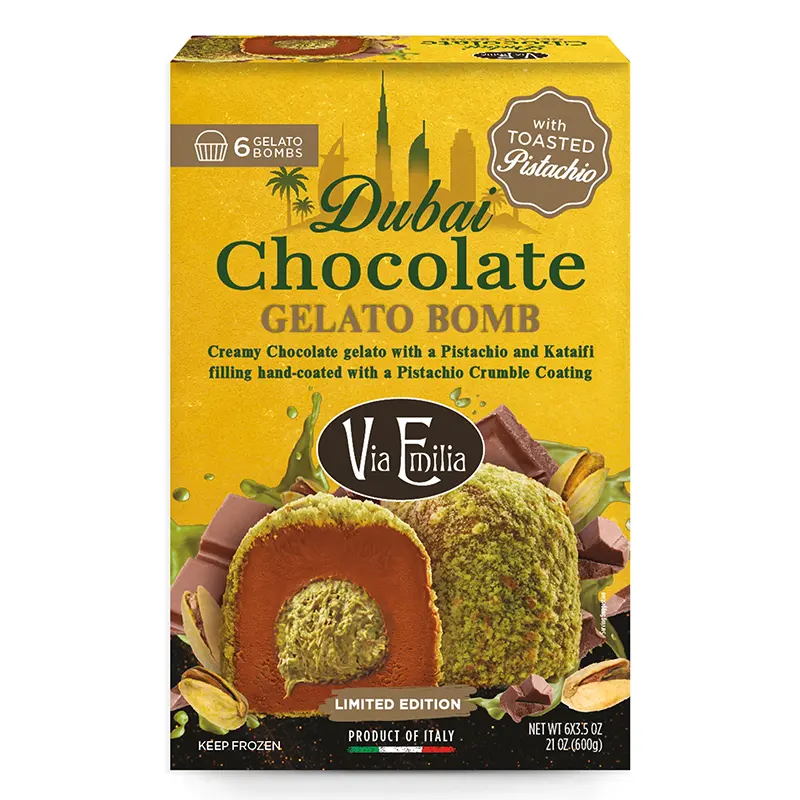 Inspired by the Dubai chocolate trend, this frozen dessert combines contrasting textures and flavours. It consists of dark chocolate gelato filled with pistachio cream and crispy kataifi pastry.