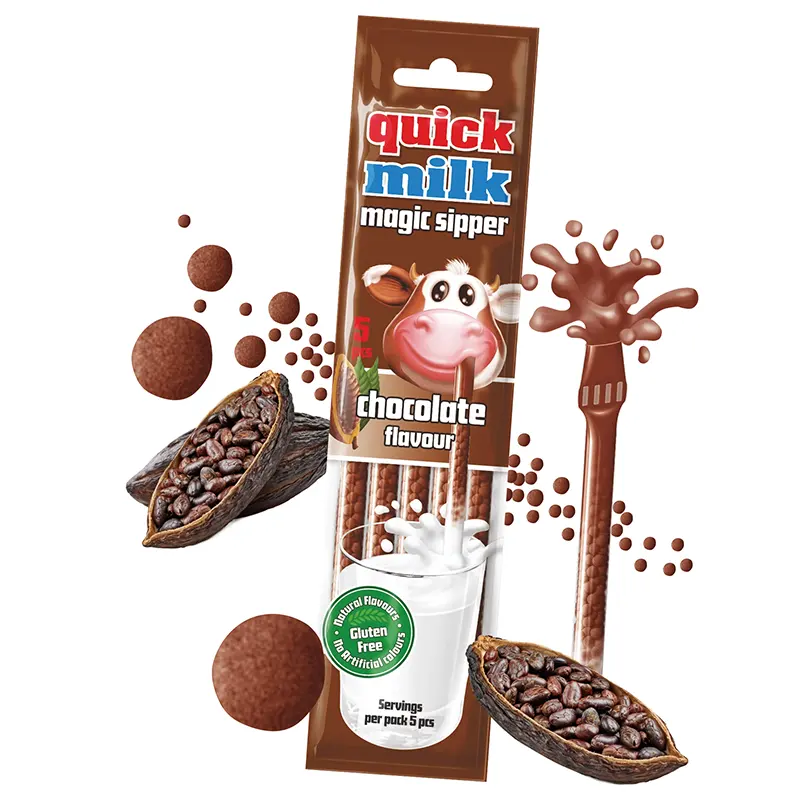 Quick Milk Chocolate is a drinking straw filled with dissolving chocolate beads that transforms milk into a chocolate-flavoured drink. It is free from gluten, lactose, GMOs and preservatives.